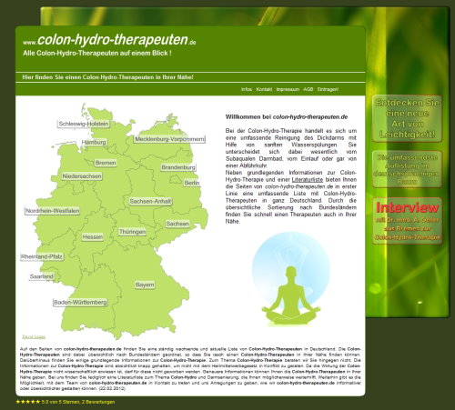 • Auf den Seiten von Colon-Hydro-Therapeuten.de finden Sie eine ständig wachsende und aktuelle Liste von Colon-Hydro-Therapeuten in Deutschland. Die Colon-Hydro-Therapeuten sind dabei übersichtlich nach Bundesländern geordnet, so dass Sie rasch einen Colon-Hydro-Therapeuten in Ihrer Nähe finden können.